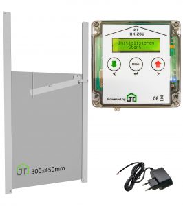Sollte sich während des Schließvorganges ein Tier unter dem Schieber befinden, wird der Motor der automatischen Hühnerklappe JT-HK2 beim Aufsetzen automatisch gestoppt. Der Nothalt-Schließvorgang wird noch 2 x automatisch wiederholt. Beim vierten Schließversuch ist die Nothaltfunktion deaktiviert. Kein Tier muss sich unter der aufliegenden Last der Klappe selber befreien wie bei allen anderen Herstellern so üblich ist.